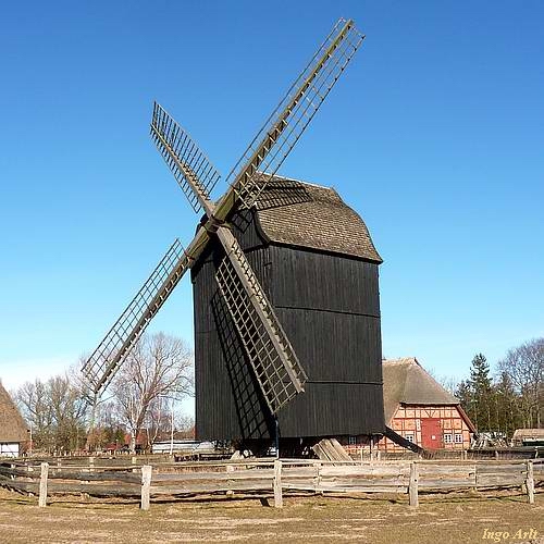 noch funktionslose Bockwindmühle in einer sehenswerte historische Dorfanlage im Museum Klockenhagen